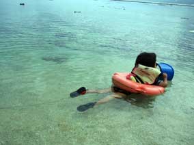 足の着く浅瀬からエントリー。シュノーケルをつけるのをいやがる子も、箱めがねを使えば、あっというまに水中の光景に夢中になります。