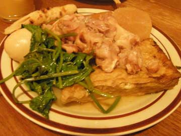 - 石垣島の繁華街といえば美崎町。その美崎町の小さな小さな路地を入ったところに、昔ながらの小さなおでんやさん「メンガテー」はあります。出汁がよーく染みこんだおでんの具は、玉子、こんにゃく、大根、ちくわ、ソーセージ、そして・・・とろっとろのテビチ!口の中で溶けます!あ~、書いてたら食べたくなってきた・・・。夕方から深夜までやっているので、早めにいくのもよし、はしご酒して締めに食べにいくのもよし(ひでは、後者です)。