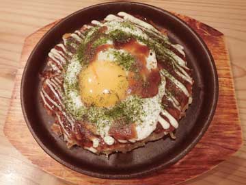 - もちろん、お好み焼きも美味しいですよ~。写真は、満月焼き。黄身をくずして絡めて食べるのがウマ~!!